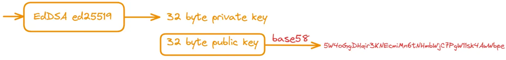5W4oGg...). - Solana addresses are just the public key encoded — no extra Keccak hashing/chopping step is required like Ethereum.